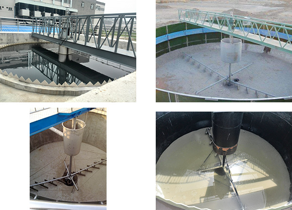 中心傳動(dòng)刮吸泥機(jī)采用中心傳動(dòng),污水從進(jìn)水管流入導(dǎo)流筒擴(kuò)散后,均勻的向周邊呈輻射狀流出,呈懸浮狀的污泥經(jīng)沉淀后沉積于池底,驅(qū)動(dòng)裝置帶動(dòng)中心豎架旋轉(zhuǎn),并帶動(dòng)刮臂及刮泥板轉(zhuǎn)動(dòng),刮泥板將污泥刮集后由吸泥管靠池內(nèi)靜水壓抽吸至中心泥缸,再通過(guò)中心排泥管排出池外,水面上的浮渣通過(guò)旋轉(zhuǎn)撇渣裝置導(dǎo)入排渣斗內(nèi)排出池外;而上清液則通過(guò)三角形出水堰板溢入出水槽內(nèi)排出。我公司將會(huì)針對(duì)用戶不同工藝控制條件要求,做相應(yīng)的配套調(diào)整設(shè)計(jì),以確保泥漿沉降分離和洗滌效果,減少浪費(fèi),節(jié)約投資成本。